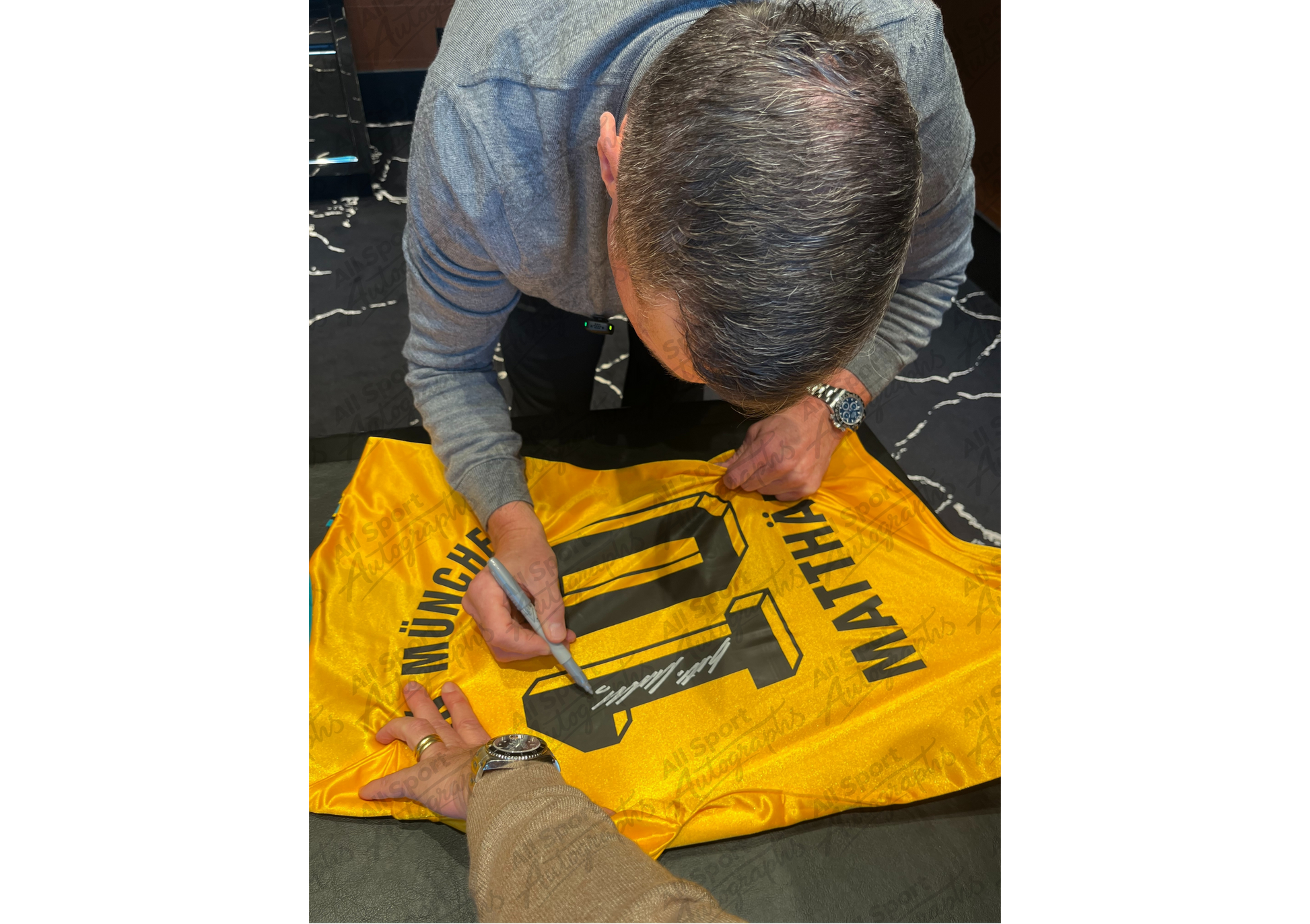 This Bayern Munich 1993/95 retro away shirt is signed by Lothar Matthäus and presented in a meticulously hand-crafted frame as part of an exclusive 20-piece collection, celebrating his commanding presence during one of the club’s most memorable eras.