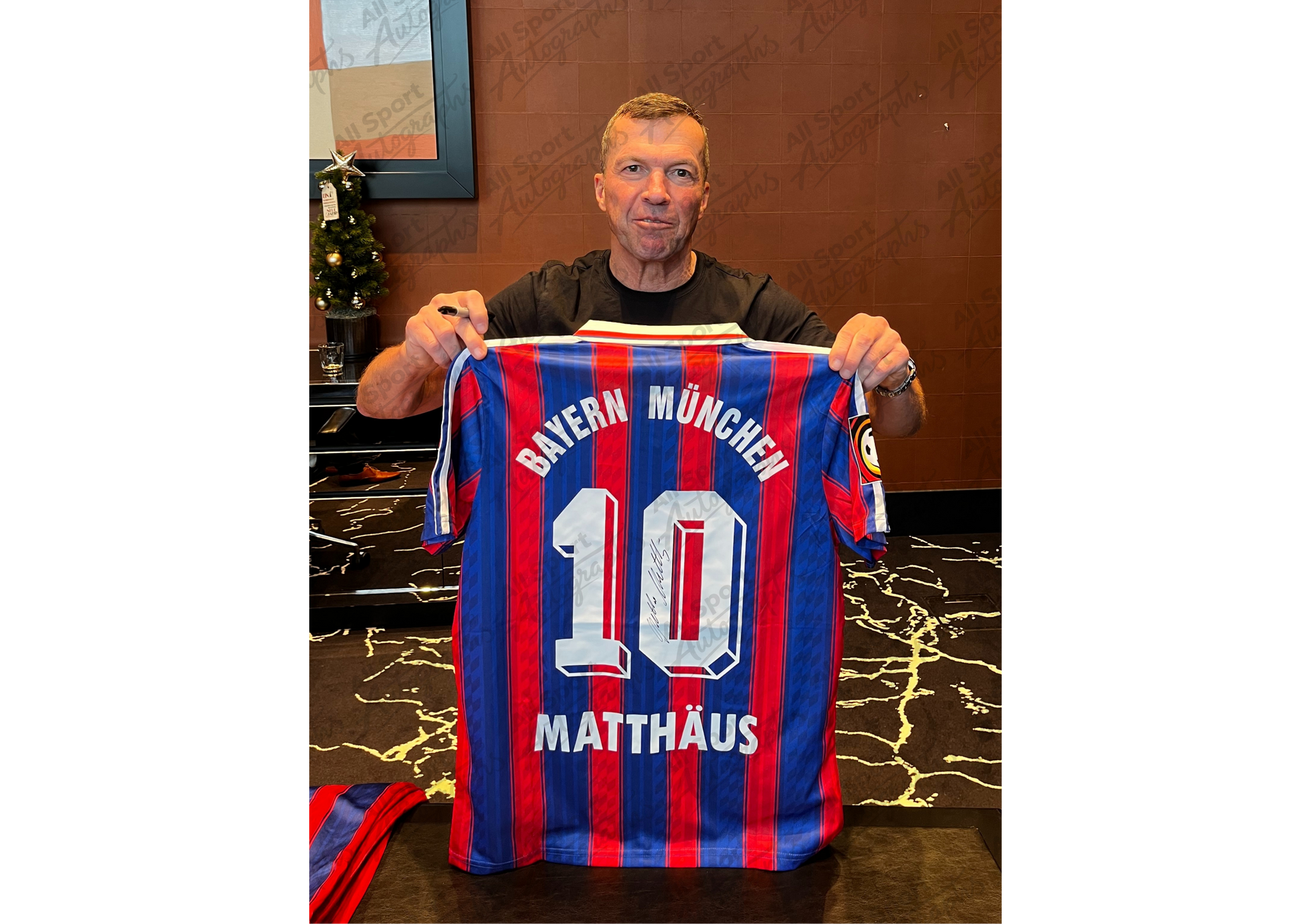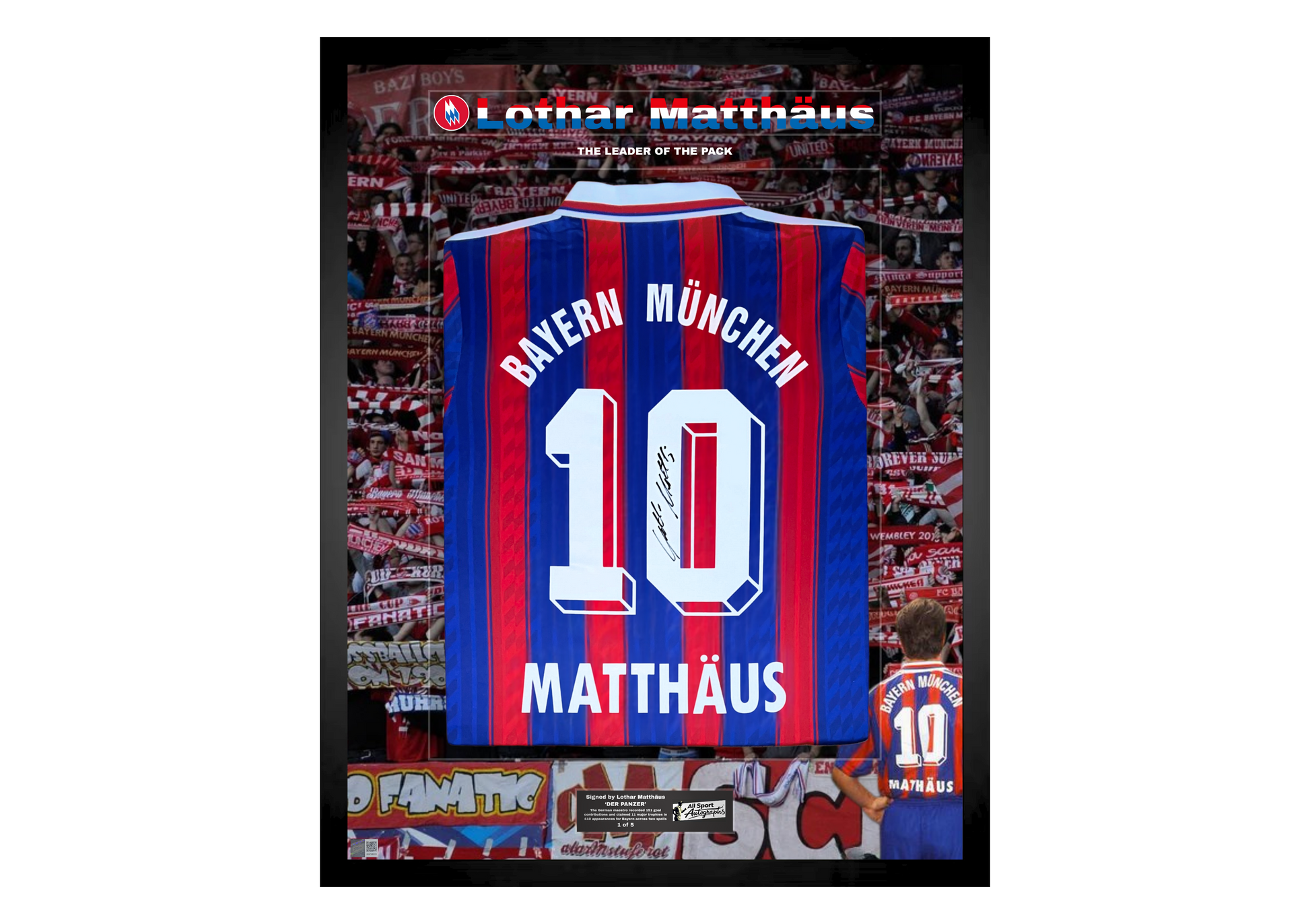 This Bayern Munich 1995/97 retro home shirt is signed by Lothar Matthäus and presented in a hand-crafted frame as part of an exclusive five-piece collection celebrating his enduring influence and leadership during one of the club’s most iconic eras.