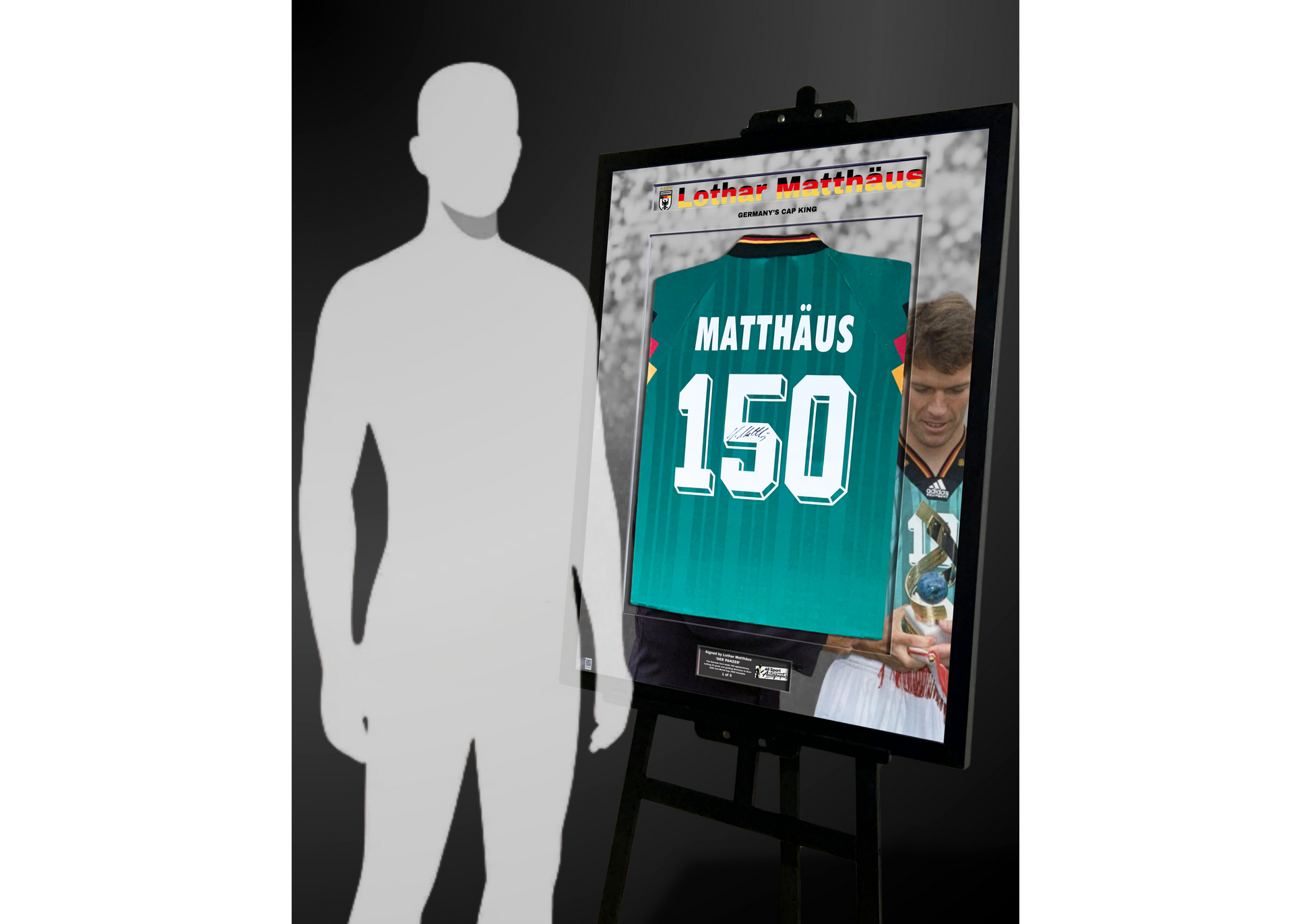 This Germany 1992/94 retro away shirt is signed by Lothar Matthäus and presented in a hand-crafted frame as part of an exclusive five-piece collection, celebrating his extraordinary international career and enduring legacy with the German national team.