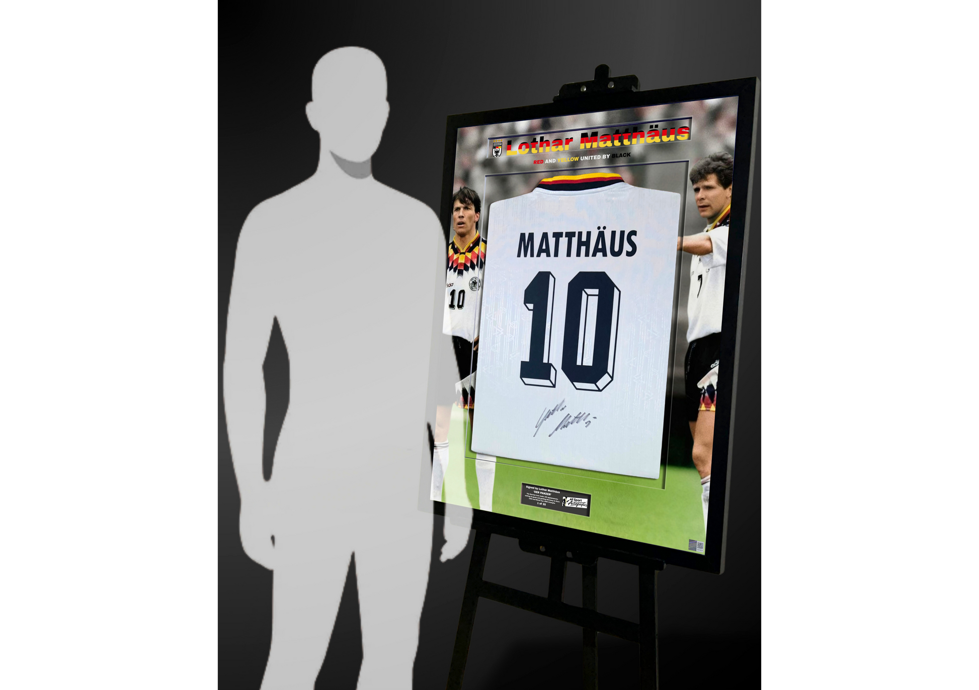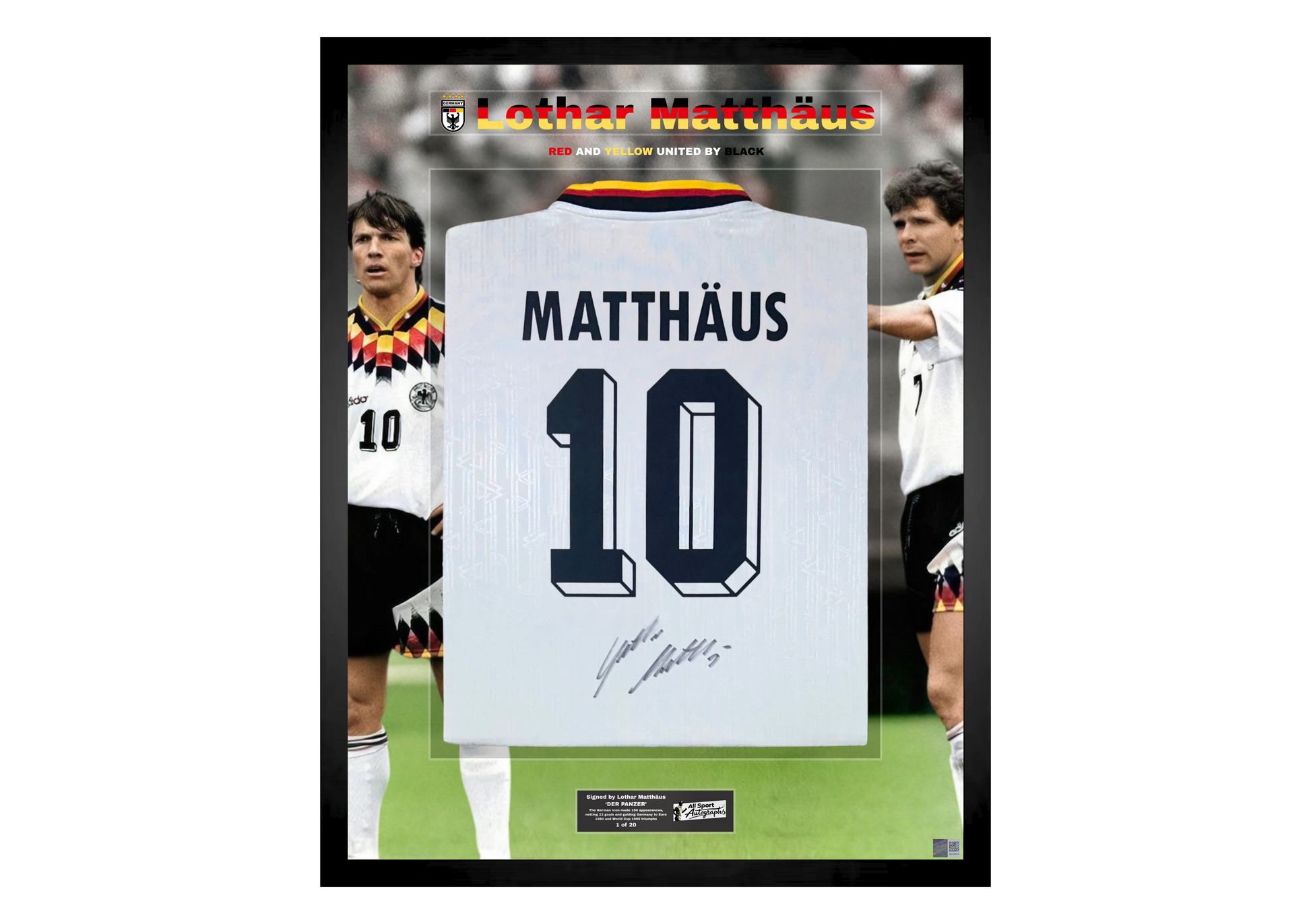 This Germany 1994 retro home shirt is signed by Lothar Matthäus and presented in a meticulously hand-crafted frame as part of an exclusive 20-piece collection, celebrating his leadership and enduring legacy on the international stage.