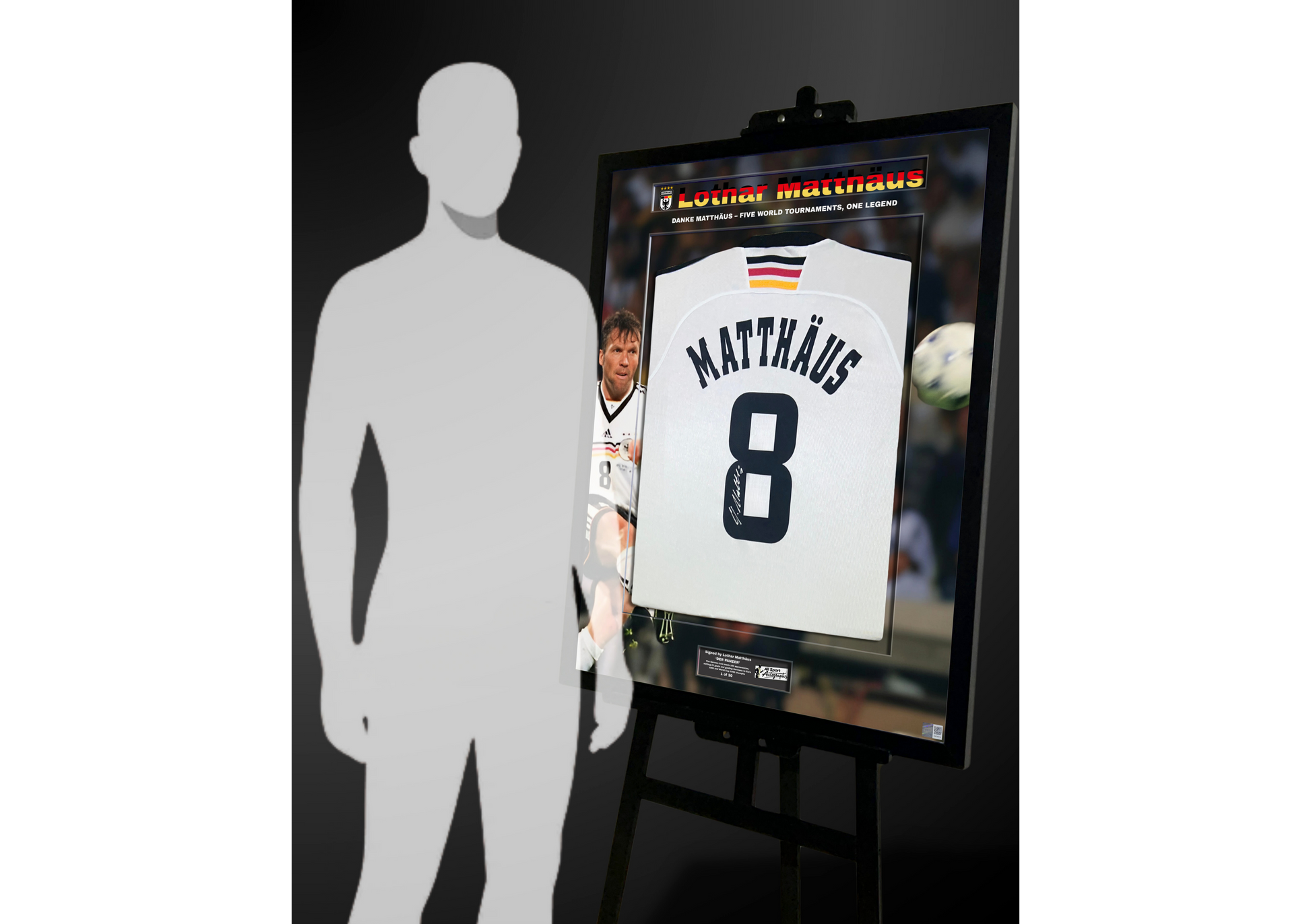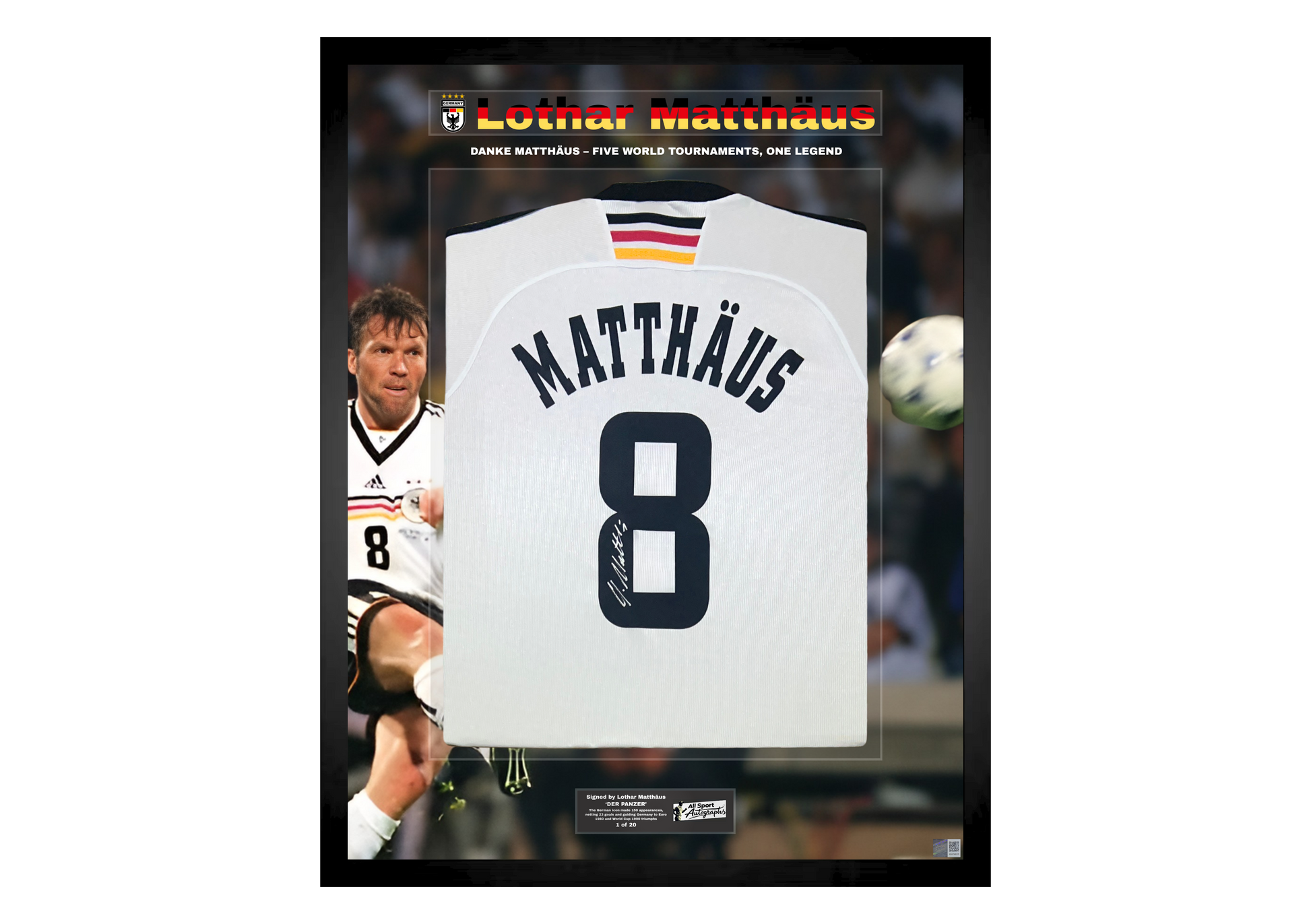 This Germany 1998 retro home shirt is signed by Lothar Matthäus and presented in a meticulously hand-crafted frame as part of an exclusive 20-piece collection, celebrating his extraordinary legacy and historic international career.