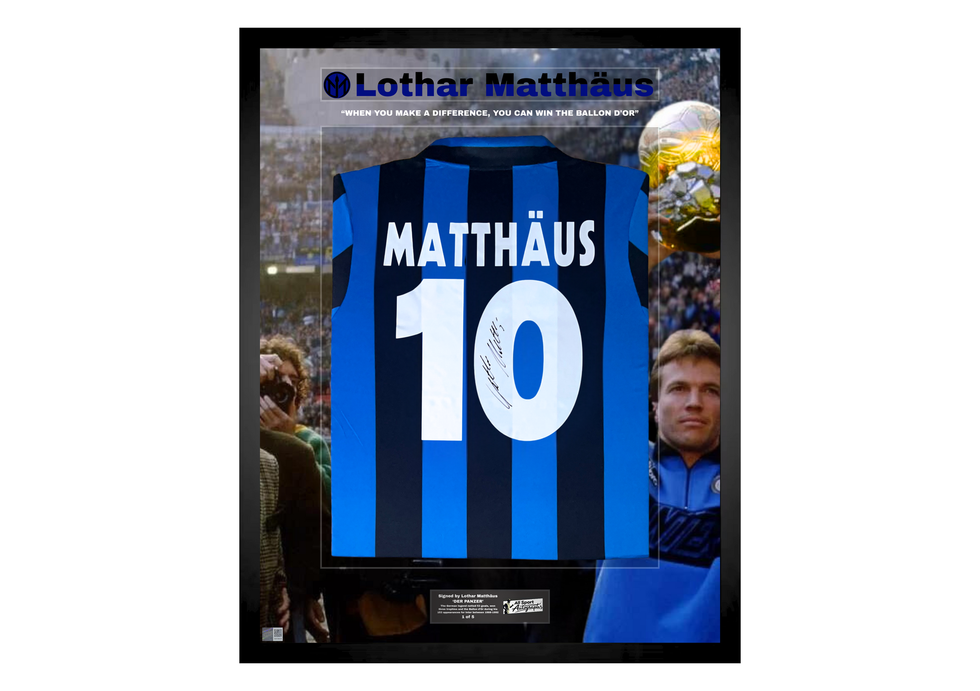 This Inter Milan 1990/91 retro home shirt is signed by Lothar Matthäus and presented in a hand-crafted frame as part of a strictly limited, five-piece collection celebrating his legendary status and unforgettable achievements with the Nerazzurri.
