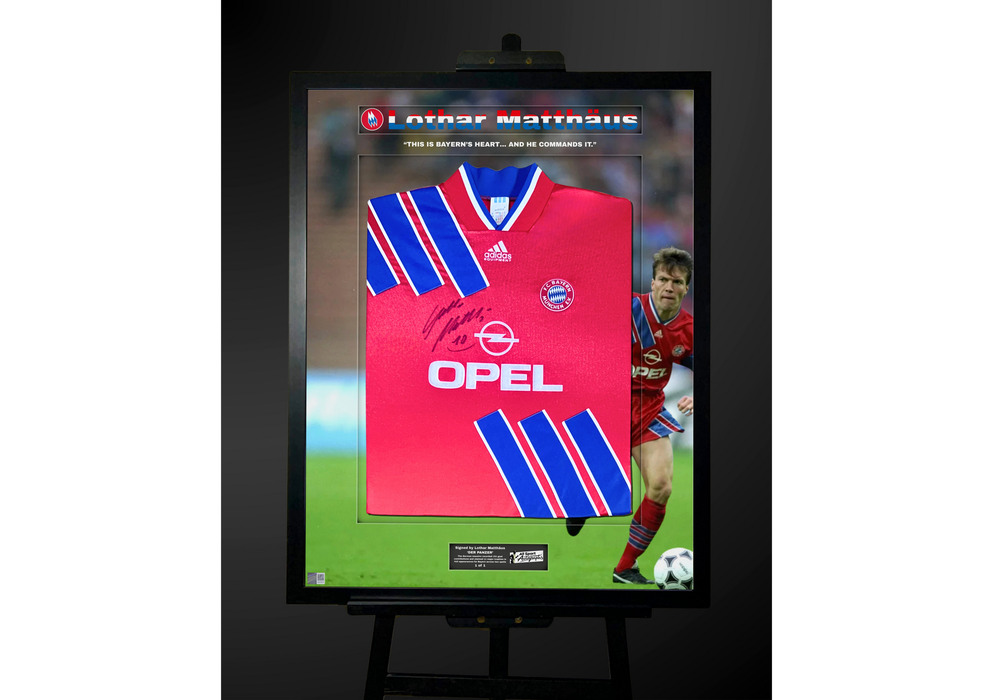 This Bayern Munich 1993/95 home shirt is signed by Lothar Matthäus and presented in a unique, hand-crafted frame as a one-of-a-kind masterpiece celebrating his commanding presence during one of the club’s most defining eras.