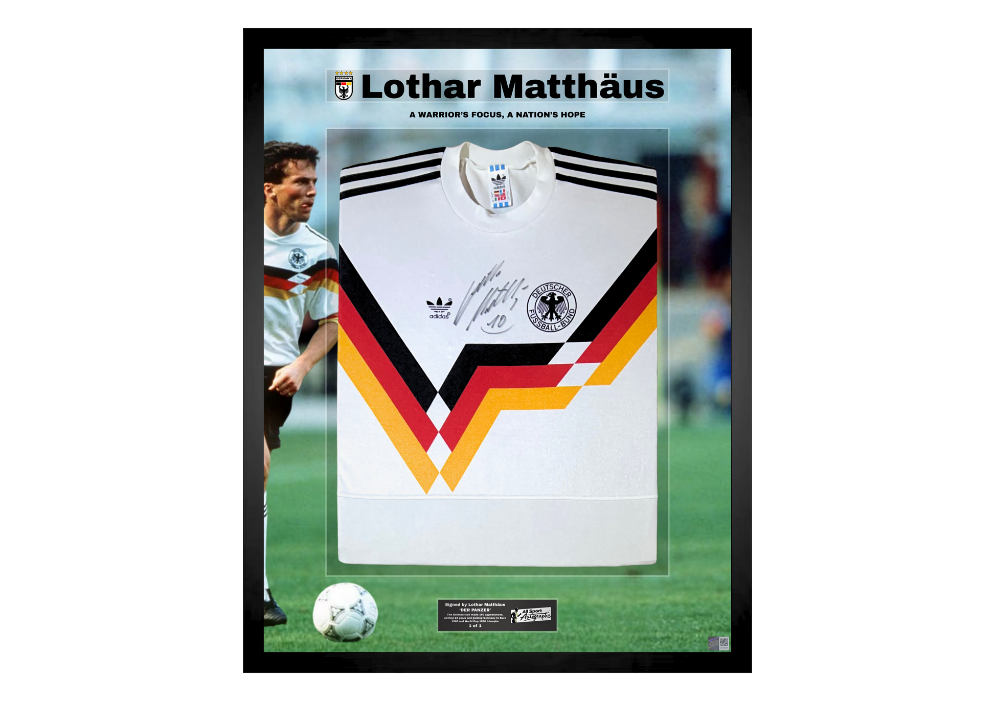This West Germany 1990 home shirt is signed by Lothar Matthäus and presented in a unique, hand-crafted frame as a one-of-a-kind masterpiece celebrating his defining role in one of football’s most iconic triumphs.
